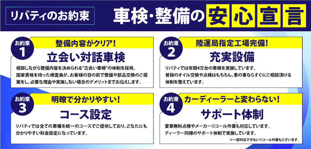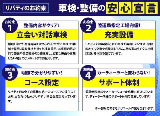 大津・栗東・彦根・守山・湖南・米原・野洲・東近江・草津・長浜・山科エリアのお客様が安心してご利用いただけるように、【車検後2年間の保証】もお付けしております。