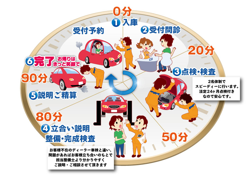 また通常90分での短時間車検の特徴として、点検終了時にお客様に実際にお車に立ち会って頂き、整備士から点検の結果についてのご報告をさせて頂きます。